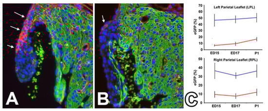 Contribution of EPDCs to the posterior leaflet of the mitral valve of control (A) and WT1cre;ALK3fl/fl;R26mG (B) hearts at ED17. The sections in panels (A,B) were stained for EGFP (immunolocalized and visualized in the red channel) to localize EPDCs, the myocardium (myosin heavy chain in green), and DAPI to visualize all nuclei. Panel (C) shows a graph with the percentage of EGFP-positive cells (determined using AMIRA 3D software), in the left and right parietal leaflets of ED15, ED17, and postnatal day 1 (P1) hearts. The blue line represents percentage of EGFP-positive cells in control hearts, the red line represents this percentage in the heart of WT1cre;ALK3fl/fl;R26mG specimens (adapted from Lockhart et al., 2014).