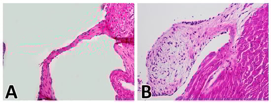 Myxomatous Valve Degeneration in the WT1cre;ALK3fl/fl mouse. Panel (A) shows H/E staining of the posterior leaflet of the mitral valve of a control heart, panel (B) shows the H/E staining of the myxomatous leaflet in a WT1cre;ALK3fl/fl littermate collected 10 days after birth.