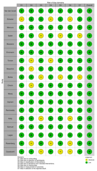 The risk of bias was assessed by two blinded, independent reviewers (LP, AT) using the Robins-I tool for nonrandomized studies [31,32]. The following domains were evaluated: confounding, selection of participants, departure from intended interventions, missing data, measurement of outcomes, and selective reporting. Discrepancies in quality assessment were resolved via consensus. The ROBVIS (Risk-Of-Bias VISualization) tool was utilized to graphically display the results [33], (Figure 1).