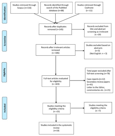 The literature search yielded 145 potentially relevant records after the duplicates had been removed. After screening the titles and abstracts, 103 studies were retrieved for full-text evaluation, and 18 studies [10,11,12,13,14,15,16,17,18,19,20,21,22,23,24,25,26,27] satisfied the predetermined search criteria and were included in the present meta-analysis as shown in the PRISMA (preferred reporting items for systematic reviews and meta-analyses) flow diagram (Figure 2).
