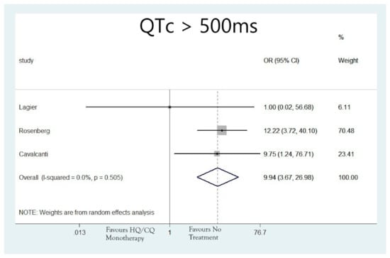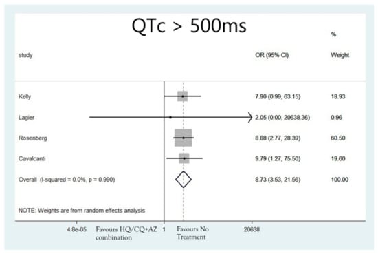 This study was a systematic review and metanalysis of the potential association between the use of hydroxychloroquine in hospitalized patients with COVID-19 patients and QTc prolongation. Our findings can be summarized as follows: (i) the QTc of patients that received hydroxychloroquine +/− azithromycin as part of their management for SARS-CoV-2 infection increased, (ii) combination therapy with hydroxychloroquine + azithromycin was associated with statistically significant increases in QTc, (iii) hydroxychloroquine alone, azithromycin alone, or the combination of the two was associated with increased number of patients that developed QTc prolongation > 500 ms.