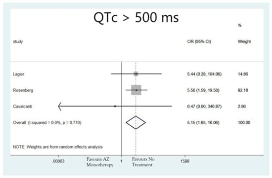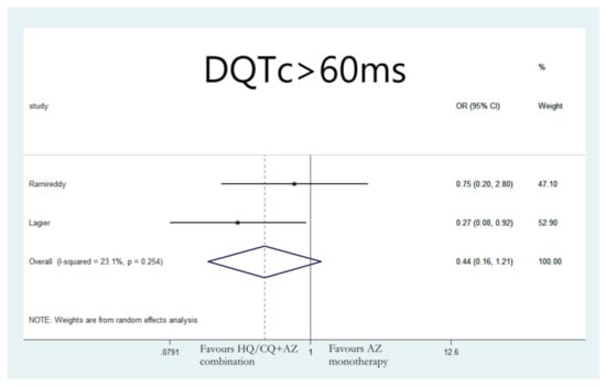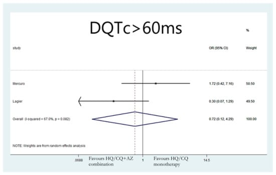 Lastly, the group of patients that received combination therapy with hydroxychloroquine and azithromycin were not found to be significantly more likely to develop ΔQTc > 60 ms compared to patients receiving hydroxychloroquine monotherapy (OR: 0.72;95% CI: 0.12, 4.29; I 2 = 67%; p = 0.722) (Figure 6), or azithromycin monotherapy (OR: 0.44; 95% CI: 0.16, 1.21; I 2 = 23.1%; p = 0.112) (Figure 7).