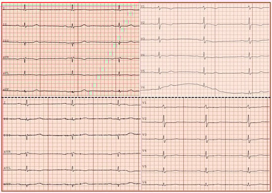 The electrocardiogram (ECG) showed sinus bradycardia 50 beats per minute (bpm), a normal axis and slight ST segment depression with T-wave inversion in leads V1–V4 and T-wave inversion in AVL (Figure 1, upper panel).