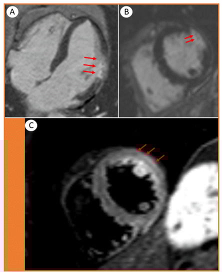 Cardiac magnetic resonance images showing (A) 4-chamber and (B,C) short axis views. The transmural distribution of late gadolinium enhancement (LGE) in the lateral wall of the left ventricle displays the extent of the infarction. (B, arrows) Microvascular obstructions are presented as tiny spots within the LGE. (C, arrows) The short-axis STIR acquisition shows edema in the lateral wall and papillary muscle.