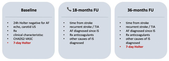 Patients were followed at 18 and 36 months after stroke. The data gathered during the follow-up period included recurrent stroke or TIA, overt AF diagnosed since stroke (confirmed in ECG), and treatment with anticoagulants. At 18 months, clinical data were gathered during a phone call, while the 36-month visit included data gathering and 7-day Holter (Figure 1).