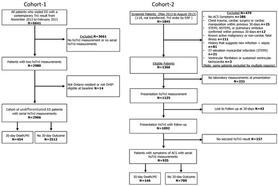 Cohort-2 was another observational cohort study (NCT01994577) conducted from May 2013 to August 2013 in patients presenting with symptoms suggestive of ACS to the ED at the same three Hamilton hospitals. Eligibility for enrollment included being an adult aged 18 or older, not being transferred from another hospital, with an ED physician having placed an order for cardiac troponin testing. Excluded participants were those patients with non-ACS symptoms (i.e., symptoms that did not include the following: chest pain/discomfort, pain or discomfort in one or both arms, pain or discomfort in the jaw, neck, back, pain or discomfort in the abdomen, shortness of breath, feeling dizzy or lightheaded, nausea and/or vomiting, diaphoresis, palpitations); or had ST-segment elevation MI at presentation; or had chest trauma, cardiac surgery or manipulation within 30-days of presentation; an MI (or pulmonary embolus) confirmed within the previous month; known active cancer or non-cardiac fatal illness; sepsis; ventricular fibrillation, or sustained ventricular tachycardia [17,19,20].