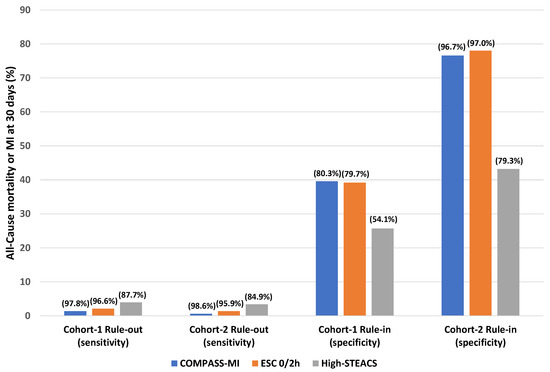 For COMPASS-MI, physicians can select different cutoffs as detailed in the original publication and using the web-based calculator (https://compass-mi.com/ accessed on 26 April 2021) [5]. However, for a hospital system, a common rule-out and rule-in pathway is beneficial for achieving standardization of care. In consultation with emergency physicians and considering analytical performance, the following cutoffs and changes were used: rule-out if 1st sample hsTnI < 4 ng/L and change < 4 ng/L between the two samples and rule-in if 1st sample hsTnI ≥ 60 ng/L or change ≥ 18 ng/L between the two samples. The 4 ng/L cutoff can be measured with acceptable precision [25] and has been used in other studies for rule-out [13,17,26], with the change < 4 ng/L representing the total analytic error for hsTn at these low concentrations [27]. The 60 ng/L has been demonstrated to provide important prognostic information for 30-day cardiac events [28] and a change of 18 ng/L represents an analytically different result for assays with coefficient of variations ≤ 10% for concentrations < 60 ng/L. Applying these parameters, in the early sampling COMPASS-MI algorithm yielded the following diagnostic estimates based on the original publication [5]: for rule-out the sensitivity was 99.0% (95% CI: 98.3 to 99.5) and NPV was 99.7% (95% CI: 99.4 to 99.8), and for rule-in the specificity was 95.5% (95% CI: 95.0 to 96.0) and PPV was 75.8 (95% CI: 73.2 to 78.2). For both ESC and COMPASS-MI algorithms, there are three categories of risk: rule-out, rule-in and uncertain (observation group). For High-STEACS, there are only two categories of risk, low and high. The lower limit of detection (LoD) for the Abbott hsTnI assay ranges from 1.1 ng/L to 1.7 ng/L (see https://www.ifcc.org/media/478962/high-sensitivity-cardiac-troponin-i-and-t-assay-analytical-characteristics-designated-by-manufacturer-v042021.pdf, accessed on 5 August 2021). The lowest LoD of 1 ng/L was used in Cohort-2 with values < 1 ng/L converted to 0.9 ng/L; however, for Cohort-1 the numerical results reported from the instruments were used with the lowest concentration being 0 ng/L (no lower analytical limit or LoD was assigned to the instruments).