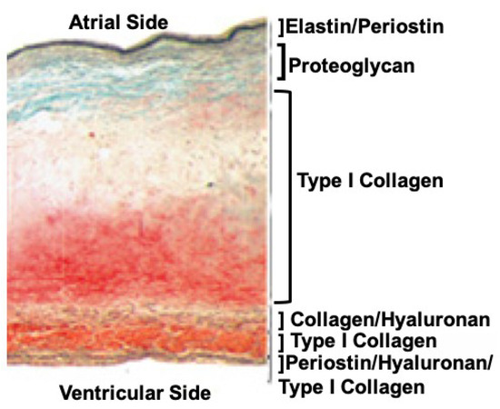 Where the chordae connect to the mitral valve’s anterior and posterior leaflets, collagen fiber orientation becomes more complex. Moving toward the annulus, the mitral leaflets thicken with collagen fibers being found in the atrial-facing elastic layer, and more densely on the ventricular side the leaflets. Collagen fibers are found in all six zones of the mitral leaflet, though they differ in density and organization (Figure 1) [3]. In the atrial-facing elastic zone, collagen fibers form a basket-like shape, with the fibers running circumferentially with sheets of elastin interwoven radially. Periostin is co-expressed with type I collagen. Collagen fibers become sparse in the proteoglycan-rich zone but are abundant in the thick, collagen-rich middle layer of the leaflets. In the next three layers, collagen fibers are found associated with hyaluronic acid, in a hyaluronic acid-free and periostin-free zone and finally, in a zone in which they are associated with periostin and hyaluronic acid. This last zone faces the ventricular side of the mitral leaflets with the largest and densest collagen fibers of the valve leaflets providing the most structural support for the leaflets.