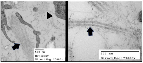 TEMs of the collagen fibers in in Hamburger Hamilton (HH) stage 42 chick (Gallus gallus) valve leaflets. The image in the right panel shows bundles of collagen fibrils arranged in two distinct originations. The fiber oriented in the plane of the figure (black arrow) displays the “D-period” striations. The fiber oriented into the plane of the figure (black arrowhead) shows the quasi-hexagonal arrangement of collagen fibers in cross-section.