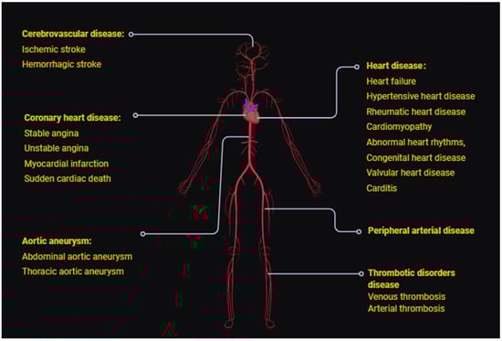 A schematic illustration of common types of CVDs including cerebrovascular disease, coronary heart disease, aortic aneurism, heart disease, peripheral artery disease, and thrombotic Disorders.