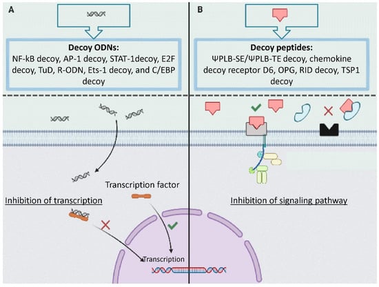 The mechanism of action of decoys: (A) decoy oligodeoxynucleotides (ODN) including NF-kB decoy, AP-1 decoy, STAT-1decoy, E2F decoy, tough decoy, R-ODN, and C/EBP decoy inhibits transcription by binding to the transcriptional factor; (B) decoy peptide including ΨPLB-SE/ΨPLB-TE decoy, chemokine decoy receptor D, decoy receptor osteoprotegerin neutralizes receptors by binding to the ligands.