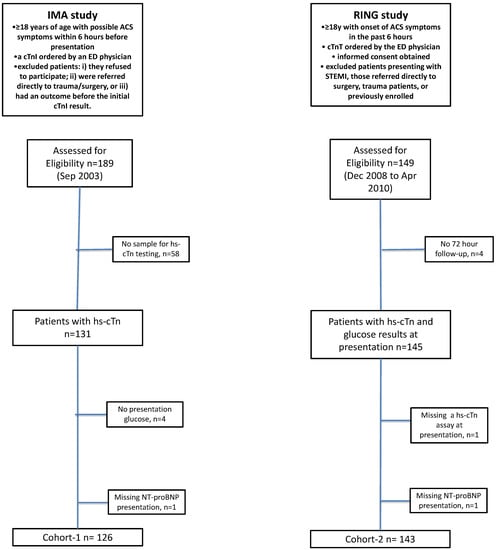 Briefly, Cohort-1 consisted of patients who consented to a study evaluating biomarkers for predicting serious cardiac outcomes (Research Ethics Board of Hamilton Health Sciences and McMaster University REB #03-135; the IMA study) [16]. In the month of September (2003), adult patients who presented with chest pain within 6 h of onset who consented to the study were enrolled. Eligibility criteria included: age 18 years or older, potential cardiac ischemia symptoms within 6 h from ED arrival and that the ED physician ordered cardiac troponin. Patients were excluded from the study if they were referred directly to the trauma or surgery teams; those in whom any of the study outcomes were obtained before the results of their first cardiac troponin results; patients who refused study participation or unable provide reliable contact information [14,16].