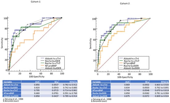 Data presented as counts, percentages, with non-parametric analyses used to describe distribution (i.e., median and interquartile range, IQR, with differences assessed via the Mann–Whitney U test and correlation by Spearman rho). Diagnostic estimates (benchmarks) included sensitivity (≥99%), specificity (≥90%), and positive (+LR ≥ 10) and negative (−LR ≤ 0.1) likelihood ratios as these estimates are not nearly as affected on prevalence as compared to predictive values [4,6,19]. For the calculation of the GuIDER score (Glucose, Injury and Dysfunction in the Emergency-setting for cardiovascular-Risk) the following algorithm was used: glucose ≥ 5.6 mmol/L = 1 point; NT-proBNP ≥ 125 ng/L = 1 point; with Abbott hs-cTnI concentration between 4–14 ng/L = 1 point/15–30 ng/L = 2 points/>30 ng/L = 3 points (Abbott GuIDER) and Roche hs-cTnT concentration between 8–18 ng/L = 1 point/19–30 ng/L = 2 points/>30 ng/L = 3 points (Roche GuIDER). The glucose and hs-cTn cutoffs were obtained from the CCS [4] with the 125 ng/L cutoff for NT-proBNP obtained from the proposed definition of HF and machine-based learning with population attributable risk percentage [2,3]. The GuIDER score ranged from 0 to 5 with the primary outcome (composite outcome) assessed based on each value. A secondary analysis consisted of assessing MI alone in the combined population designating the population into three groups: low-risk (GuIDER score 0 and 1), intermediate-risk (GuIDER score 2 and 3) and high-risk (GuIDER score 4 and 5) was also performed. ROC curve analyses were performed for NT-proBNP, hs-cTnI, hs-cTnT, Abbott GuIDER and Roche GuIDER with the DeLong test used to evaluate for differences between AUCs for each cohort for the primary outcome [20]. Analyses were performed using MedCalc® Statistical Software version 20.009 (MedCalc Software Ltd., Ostend, Belgium; https://www.medcalc.org; 2021) with p-values < 0.05 considered significant.