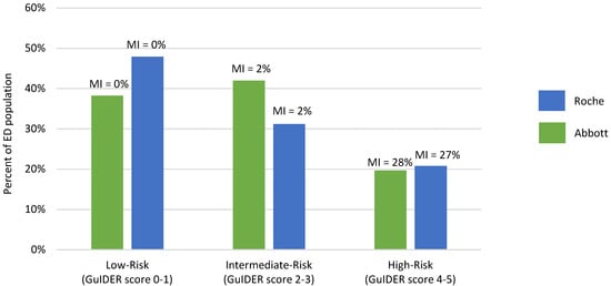 Percentage of primary outcome per the GuIDER scores using both Abbott hs-cTnI and Roche hs-cTnT for the combined cohorts.