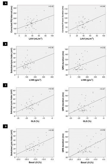 Correlation between electrocardiographic and echocardiographic parameters; (A)—Correlation between corrected PQ interval and maximum left atrial volume indexed to body surface area (LAVI) and between corrected P-wave duration and LAVI; (B)—Correlation between Sokolow–Lyon index and left ventricular mass indexed to body surface area (LVMI) and between QRS duration and LVMI; (C)—Correlation between Sokolow–Lyon index and Global Longitudinal Strain (GLS) and between QRS duration and GLS; and (D)—correlation between Sokolow–Lyon index and Basal Longitudinal Strain (LS) and between QRS duration and Basal LS.