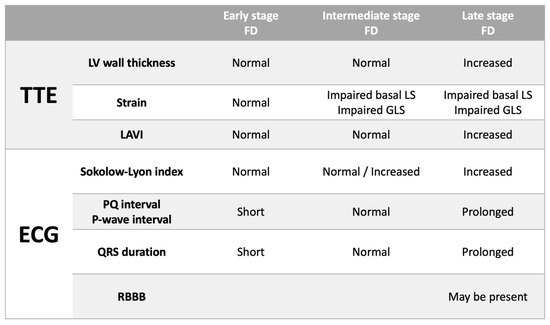 Therefore, we have proposed a model which highlights these findings and demonstrates corresponding ECG and TTE findings that could be expected with disease progression in FD (Figure 3): In early-stage FD, LV wall thickness, GLS and basal LS are normal—ECG characteristics may include shortened PQ interval and QRS duration due to enhanced conduction (although this was not seen in our cohort probably due to most of our cohort being at a later stage in the disease process); In intermediate stage FD, LV wall thickness is normal although there may be evidence of impairment in longitudinal strain, particularly basal LS—in such patients the PQ interval and QRS duration lengthen so that they lie within the normal range and the Sokolow–Lyon index may be increased; In late-stage FD, LV wall thickness is increased and GLS as well as basal LS are impaired—ECG characteristics would include evidence of LVH (increased Sokolow–Lyon index) and prolongation of the PQ interval and QRS duration (with a predilection for development of RBBB).