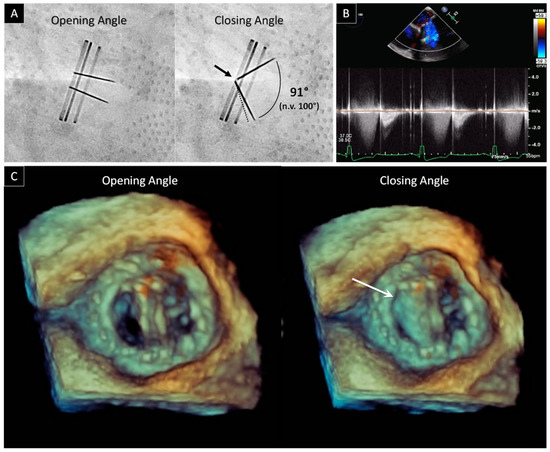 Bileaflet mechanical mitral valve obstruction. (A) Fluoroscopic evaluation of normal opening and abnormal closing angles in a patient with prosthetic mitral valve dysfunction. The dotted line refers to the normal leaflet closure. The abnormal leaflet closure was confirmed by the lack of leaflets contact at the hinge area (black arrow). (B) Holosystolic regurgitation at continuous wave Doppler by TEE. (C) 3D view of prosthetic mitral valve from atrial side. During systole, only one leaflet closes (white arrow).