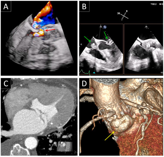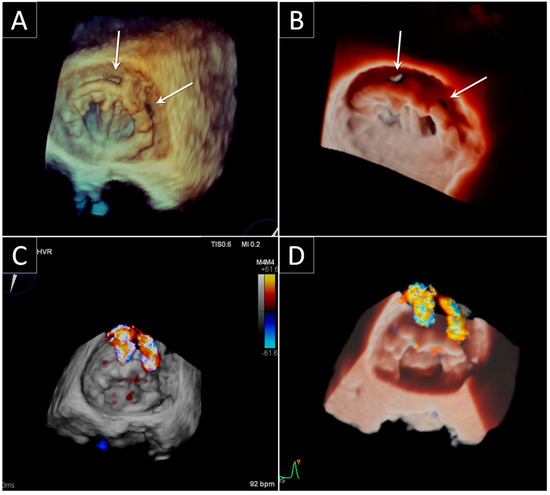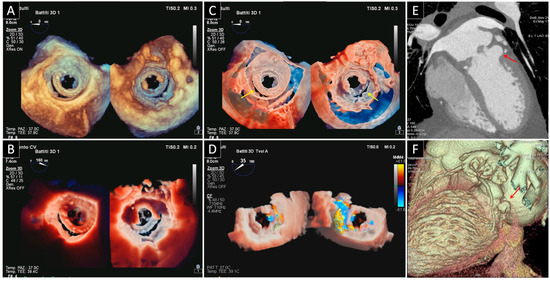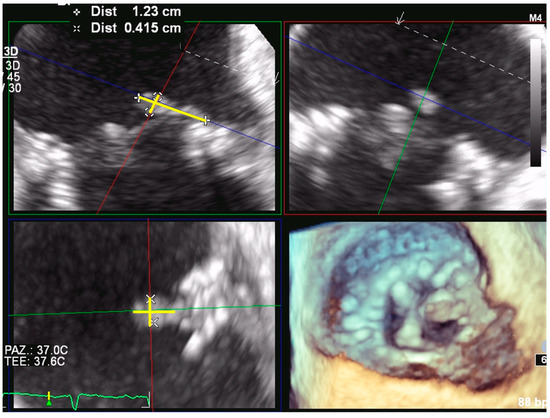 PVE is the most severe form of infective endocarditis and occurs in 1–6% of patients with PV. This affects mechanical and biological PV equally [43]. Diagnosis is more difficult in PVE than in native valve endocarditis as clinical presentation is frequently atypical and the Duke criteria has lower sensitivity in the setting of PVE [44]. Post-operative PVE occurs during the first year after valve replacement, frequently caused by staphylococci. The infection usually involves the junction between the sewing ring and the annulus, leading to perivalvular abscess, dehiscence, pseudo-aneurysm and fistulae (Figure 6). After 1 year, the distribution of microorganisms causing PVE is similar to that causing endocarditis on native valve. In late PVE, infection is frequently located on the prosthetic leaflets, leading to vegetations, cusp rupture and perforation [45]. TTE remains the cornerstone of imaging. This is in fact rapid, straightforward, and, in many cases, diagnostic [46]. A negative TTE, though, can be frequently observed in PVE, due to prosthetic reverberations and shadowing. For this reason, TEE imaging is strongly recommended [11,24,45] and, if negative, the procedure must be repeated in case of high suspicion of infective endocarditis. TEE is the gold standard, especially for the detection of vegetations and the measurement of its length, which both have a major impact on the risk of embolism and on the indication of early surgery. TEE is also preferable to TTE in localizing PVL and in the assessment of leaflet malfunction and prosthetic dehiscence. 3D TEE has an even wider role than 2D TEE. In fact, 3D TEE provides incremental anatomic information allowing for a far better visualization of cardiac anatomy. Therefore, it helps in assessing paravalvular’s extension of infection, prosthetic dehiscence, valve perforation and in measuring the diameter of irregular masses (i.e., vegetations) (Figure 7). Since the major diameter of vegetations is currently the cutoff point to indicate surgery in patients without other surgical indications, differences between measurements by 2D and 3D TEE may have therapeutic consequences [47].