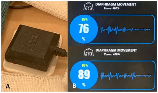Novel diaphragm movement sensor (DMS). (A) The novel diaphragm movement sensor is placed on an electrode below the right-sided costal cartilage. (B) Section of the SMARTFREEZE Cryoablation Console surface with visualization of the DMS during pacing of the right-sided phrenic nerve and isolation of the right inferior pulmonary vein.