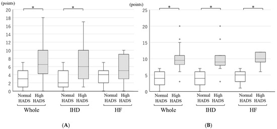 Scores for anxiety and depression by HADS in normal HADS group and high HADS group by whole patients, IHD patients, or HF patients. The scores for (A) anxiety and (B) depression by HADS in the normal and high HADS group of whole, IHD, and HF patients are shown by a box plot. White box indicates the normal HADS group and grey box indicates the high HADS group. White circle indicates outlier. IHD: ischemic heart disease, HF: heart failure. * p < 0.05.