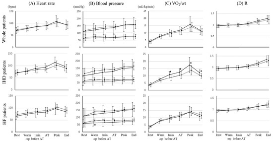 The differences of hemodynamics and exercise tolerance in CPET between normal HADS group and high HADS group in whole patients, IHD patients, and HF patients. (A) Heart rate, (B) blood pressure, (C) VO2/wt, and (D) respiratory exchange ratio in whole, IHD, and HF patients are shown. A solid line and circle marker indicates the normal HADS group and a dotted line and square marker indicates the high HADS group. CPET: cardiopulmonary exercise test, IHD: ischemic heart disease, HF: heart failure, VO2/Wt: oxygen uptake per weight, R: respiratory exchange ratio, and AT: anaerobic threshold. * p < 0.05.