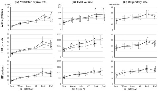The differences of respiration activities in CPET between normal HADS group and high HADS group in whole patients, IHD patients, and HF patients. (A) Ventilator equivalents, (B) tidal volume, and (C) respiratory rate in whole, IHD, and HF patients are shown. A solid line and circle marker indicates the normal HADS group and a dotted line and square marker indicates the high HADS group. CPET: cardiopulmonary exercise test, IHD: ischemic heart disease, HF: heart failure, AT: anaerobic threshold. * p < 0.05.