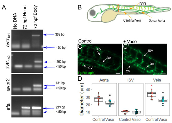 Application of vasopressin causes vasoconstriction of major blood vessels in zebrafish by 48 hpf. (A) RT-PCR of vasopressin receptors in whole body vs. cardiac tissues. (B) Diagram of zebrafish vasculature. The orange line indicates site of measurement. (C) Vasculature of control and (C’) vasopressin-treated embryos at 48 hpf. (D) Diameter of cardinal vein (CV), dorsal aorta (DA), and intersegmental vessels (ISV). For D: n = 11 for wildtype, n = 11 for vasopressin-treated embryos. Two-sided t-test was performed to validate statistical significance; * indicates p < 0.05. Scale bar represents 50 µm.