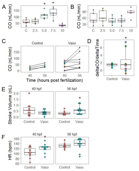 Increased pressure causes chamber remodeling by 56 hpf. (A) Cardiac output (CO) at 40 hpf at increasing doses of vasopressin (control, 2.5, 5, 7.5, and 10 µm). (B) CO at 56 hpf at increasing doses of vasopressin (vaso). n = 5 fish per group. (C) Cardiac output at 40 and 56 hpf in control and 10 µm vaso-treated fish. Each colored dot represents an individual fish; orange-colored dots represent control fish, light blue represents mildly-affected fish, and purple represents severely-affected fish. n= 4 control, 8 vaso. (D) Rate of change for cardiac output with respect to time. (E) Stroke volume and (F) heart rate of control and 10 µm vaso-treated fish at 40 and 56 hpf. n = 11 control and 12 vaso-treated fish at 40 hpf, and 8 and 13 vasopressin-treated fish at 56 hpf. * indicates p < 0.05.