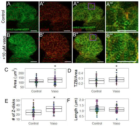 In order to determine whether increased myofibril content could account for the increase in stroke volume observed in embryos treated with the 10 µM dose of vasopressin at 56 hpf, we measured myofibril content of individual ventricular outer curvature cardiomyocytes using the Tg(myl7:cypher-eGFP) line, in which cypher (a z-disc protein) has been tagged with eGFP (Figure 3). We performed immunohistochemistry using the ALCAM (activated leukocyte cell adhesion molecule; also called DM-GRASP) antibody, which marks myocardial cell borders to measure the cross-sectional area of each ALCAM-labeled cell (Figure 3A,B’’’). We observed that cells exposed to 10 µM vasopressin were approximately 10% larger than their untreated counterparts (p = 0.04) (Figure 3C), consistent with the rhodamine-phalloidin data above. After being normalized to the individual cell area, the data indicated an approximately 5% average increase in TZB in vasopressin-treated cardiomyocytes beyond what was expected by the cells’ larger size (p = 0.03) (Figure 3D). Further experiments were conducted to determine whether the z-band number (a rubric for the number of sarcomeres present) or average z-band size (reflecting the thickness of the sarcomere) accounted for the increased TZB. We found the number of z-bands per cell was significantly increased from 25.3 z-bands/cell in the control embryos to 32.4 z-bands/cell in the vasopressin-treated embryos (p < 0.001) (Figure 3E), suggesting that treated cells increased their myofibril content. However, the average length of individual z-bands was not significantly affected (p = 0.24) (Figure 3E), suggesting that myofibril thickness was not changed. This pattern of increased number of sarcomeres is consistent with pathological concentric hypertrophy.
