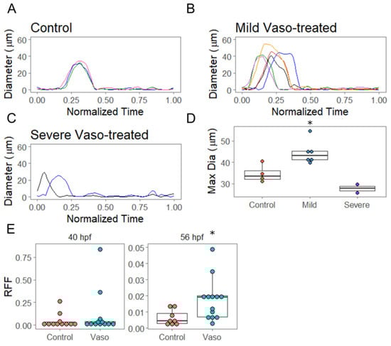 In order to evaluate the valve formation and function, we measured how the diameter of the AVJ varied across the cardiac cycle in the hearts of live embryos. The hearts of the vasopressin-treated embryos were scored initially as either ‘mild’ or ‘severe’ based on their appearance at 40 hpf, and then videoed at 56 hpf. We noted that the dynamics of AVJ behavior during the cardiac cycle were significantly altered under conditions of increased loading (Figure 4). The AVJ of the control embryos displayed uniform behavior, opening with an average maximal diameter of 34.7 µm (Figure 4A,D). The vasopressin-treated embryos initially scored as ‘mild’ showed significantly increased average maximal diameter of 44.5 µm by 56 hpf (p = 0.015 by t-test) (Figure 4B,D). The vasopressin-treated embryos initially scored as ‘severe’ at 40 hpf displayed reduced average maximal diameters of 27.7 µm by 56 hpf (p = 0.10 by t-test) (Figure 4C,D). Moreover, AVJs in the vasopressin-treated hearts open significantly earlier than the control counterparts (controls at 40% all vasopressin-exposed embryos at 11%, p = 0.04). Both groups of vasopressin-treated embryos displayed an increased retrograde flow fraction (RFF), quantified as follows: , where Q is the flow rate and T is the cardiac cycle period []. In the vasopressin-treated embryos, RFF increased approximately three-fold over controls by 56 hpf (Figure 4E, p = 0.01). Together, these data demonstrate that despite the ability of the 10 µM vasopressin-treated hearts to maintain cardiac output, the alterations in loading nevertheless substantially impacted other aspects of heart development, including blood flow patterns and AVJ closing dynamics.