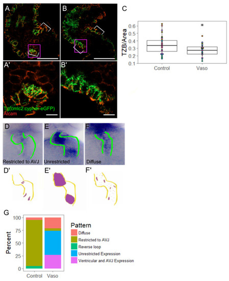 Increased pressure alters AVJ myocyte morphology and specification. (A) Control and (B) vaso-treated hearts showing z-disks and cell shape through ALCAM immunohistochemistry at 56 hpf. Purple box shows region of interest shown in (A′,B′). For (A,B), scale bar represents 20 µm. (A′) Control and (B′) vaso-treated hearts. Scale bar represents 10 µm. White arrow heads indicate AVJ. (C) TZB of sarcomeres present in each cell normalized to the area of each cell (1/µm). n = 36 cells for control and 33 for vaso-treated hearts. (D) In situ hybridization (ISH) of myocardial AVJ marker bmp4 in control and (E,F) vaso-treated hearts. (D′–F′) Diagrams of ISH expression patterns. (G) Percent of fish expressing a particular bmp4 expression pattern. A total of 20 fish were scored in each group. * indicates p < 0.05.