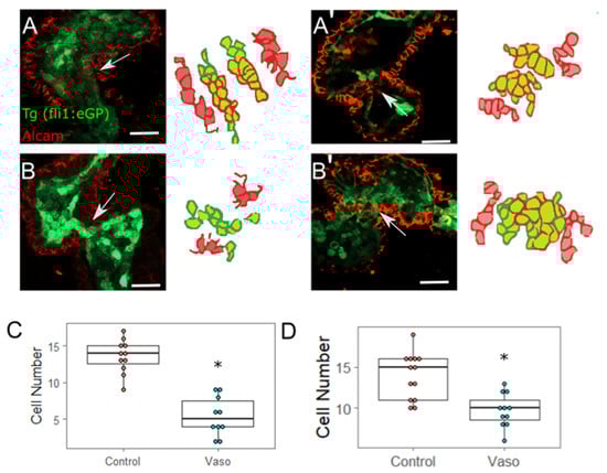 During valve development in mammals, endocardial cells undergo EMT, invade the endocardial cushions and become specified valve cells []. Although controversy exists regarding whether true EMT occurs in the AVJ of zebrafish [,], AVJ endocardial cells transition to a more cuboidal shape by 48 hpf, and endocardial cells from the superior valve leaflet fold into the cardiac jelly around 60 hpf. ALCAM is a well-characterized marker that appears at the cell periphery from 52 hpf onward only in AVJ endocardial cells that have become specified to a valve cell fate [] (in contrast, myocardial cells express ALCAM throughout development). In order to evaluate endocardial AVJ development, we performed immunohistochemistry on the dissected wildtype and vasopressin-treated hearts at 56 hpf to detect ALCAM. Since these hearts were derived from Tg(fli1:eGFP) embryos, this method labels myocardial cells (red), chamber endocardial cells (green), and nascent valve endocardial cells in the AVJ (double-labeled red and green) (Figure 6A,B’). The results indicated a 45% reduction in the number of double-labeled ALCAM-positive valve-forming endocardial cells in the vasopressin-treated embryos (Figure 6C, p = 0.000019). In order to test whether AVJ formation was simply delayed in the vasopressin-treated embryos, we repeated the same experiment at 72 hpf. We again noted a significant reduction (approximately 30% fewer) in the number of ALCAM positive endocardial cells in the vasopressin-treated embryos (n = 12 control, 11 vasopressin treated; p = 0.004). These data strongly suggest that aberrant loading perturbs AVJ development by limiting the number of endocardial AVJ cells that achieve a specified state.