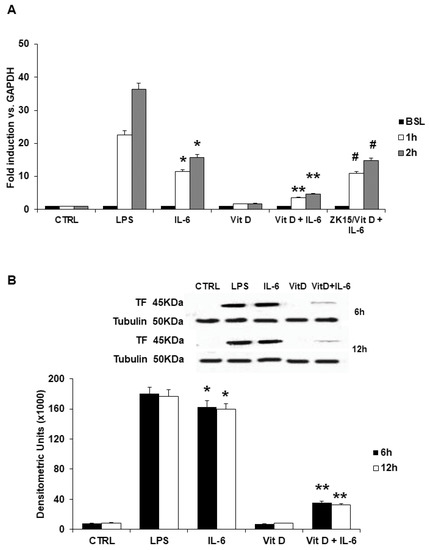 (A) Effects of VitD on IL-6-induced TF transcription in human endothelial cells assessed by Real Time quantitative PCR. TF mRNA was undetectable at baseline. Incubation with IL-6 caused significant increase in TF-mRNA levels, as compared to unstimulated cells. Preincubation with VitD inhibited the IL-6 effect on TF-mRNA. The use of ZK15, a VDR antagonist, completely abolished its effect. LPS served as positive control. Data are expressed as fold induction versus control gene represented by GAPDH. Each bar represents the mean ± SD of 3 different experiments. (* p < 0.001 vs. Control; ** p < 0.001 vs. IL-6; # p = NS vs. IL-6; one-way ANOVA with Tukey’s post hoc test). (B) Effects of VitD on IL-6-induced TF protein evaluated by Western blot analysis of cell lysates. IL-6 caused a significant increase in TF protein levels. These effects were prevented by treatment with VitD. Tubulin served as loading control. LPS served as positive control. Each bar represents the mean ± SD of 6 different experiments (* p < 0.001 vs. Control; ** p < 0.001 vs. IL-6; one-way ANOVA with Tukey’s post hoc test). The insert shows results of a representative experiment.