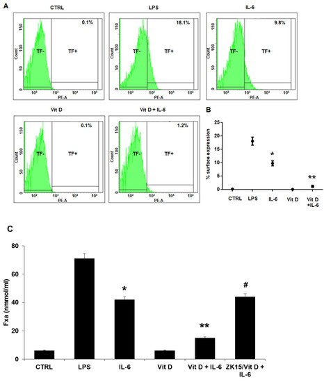 (A) FACS analysis showed that IL-6 induced TF expression on cell surface. In controls (CTRL) and in cells cultivated with VitD alone, TF was almost not detectable on membranes (0.1%). Stimulation with IL-6 caused TF+ in 9.8 ± 1.8% of cells. In IL-6-treated cells preincubated with VitD, TF+ cells were reduced to 1.2 ± 0.8%. LPS served as positive control. (B) Graph of FACS analysis experiment. Each point represents the mean ± SD of 6 experiments. (up to 18% TF+ cells; * p < 0.001 vs. Control; ** p < 0.001 vs. IL-6 with Tukey’s post hoc test). (C) Effects of VitD on IL-6-induced TF activity evaluated by a two-step colorimetric assay based on the ability of TF/FVIIa to promote generation of coagulation FXa. IL-6-induced-TF activity reflects results observed for TF expression, confirming that TF was functionally active. VitD preincubation significantly reduces TF activity. The use of ZK15 abolished the VitD effect. LPS served as positive control. Each column represents the mean ± SD of 6 experiments in triplicate (* p < 0.001 vs. Control; ** p < 0.001 vs. IL-6, # p = NS vs. IL-6; one-way ANOVA with Tukey’s post hoc test).