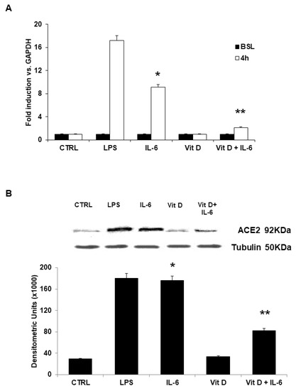 (A) Effects of VitD on IL-6-induced ACE2r transcription in human endothelial cells assessed by Real Time quantitative PCR. ACE2r mRNA was undetectable at baseline. Incubation with IL-6 caused significant increase in ACE2r mRNA levels, as compared to unstimulated cells. Preincubation with VitD inhibited the IL-6 effect on ACE2r-mRNA. LPS served as positive control. Data are expressed as fold induction versus control gene represented by GAPDH. Each bar represents the mean ± SD of 3 different experiments. (* p < 0.001 vs. Control; ** p < 0.001 vs. oxLDL; one-way ANOVA with Tukey’s post hoc test). (B) Effects of VitD on IL-6-induced ACE2r protein evaluated by Western blot analysis of cell lysates. IL-6 caused a significant increase of ACE2r protein levels. These effects were prevented by treatment with VitD. Tubulin served as loading control. LPS served as positive control. Each bar represents the mean ± SD of 6 different experiments (* p < 0.001 vs. Control; ** p < 0.001 vs. IL-6; one-way ANOVA with Tukey’s post hoc test). The insert shows results of a representative experiment.