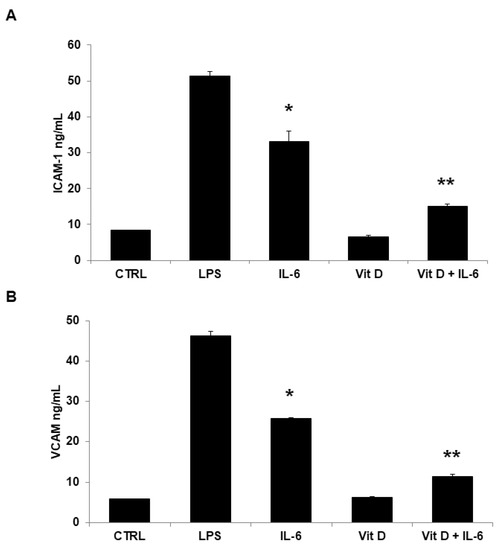 Soluble CAMs were assessed in cell supernatants by specific ELISA kits. Very low basal levels of soluble ICAM-1 and VCAM-1 were measured in unstimulated cells and in cells stimulated with VitD alone. On the contrary, incubation with IL-6 was associated with a significant increase of soluble CAM levels in cell supernatants. VitD preincubation significantly prevented ICAM-1 and VCAM-1 expression at a similar extent (Figure 4A,B).