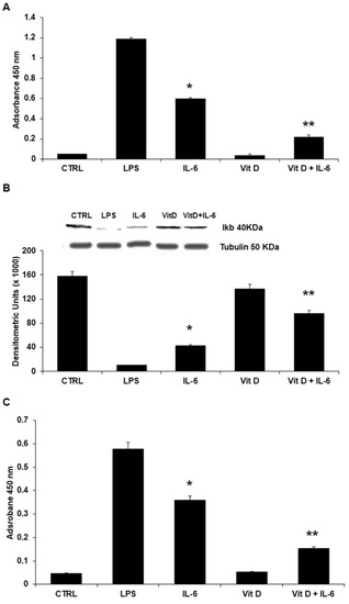 (A) In HUVEC incubated with IL-6, a significant increase of NF-kB levels was observed. Pretreatment of endothelial cells with VitD prevented the IL-6 effects on NF-kB. LPS served as positive control. Each bar represents the mean ± SD of 3 different experiments. (* p < 0.001 vs. Control; ** p < 0.001 vs. IL-6, one-way ANOVA with Tukey’s post hoc test). (B) Western blot analyses. IL-6 stimulation results in significant reduced levels of IκB. Conversely, preincubation with VitD restores IκB levels. LPS served as positive control. Each bar represents the mean ± SD of 3 different experiments. (* p < 0.001 vs. Control; ** p < 0.001 vs. IL-6, one-way ANOVA with Tukey’s post hoc test). The insert shows results of a representative experiment. (C) In HUVEC incubated with IL-6, a significant increase of STAT3 levels was observed. Pretreatment of endothelial cells with VitD prevented the IL-6 effects on STAT3. LPS served as positive control. Each bar represents the mean ± SD of 3 different experiments. (* p < 0.001 vs. Control; ** p < 0.001 vs. IL-6, one-way ANOVA with Tukey’s post hoc test).