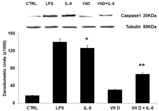 IL-6 caused a significant increase in Caspase-1 protein levels. These effects were prevented by treatment with VitD. Tubulin served as loading control. LPS served as positive control. Each bar represents the mean ± SD of 6 different experiments (* p < 0.001 vs. Control; ** p < 0.001 vs. IL-6; one-way ANOVA with Tukey’s post hoc test). The insert shows results of a representative experiment.