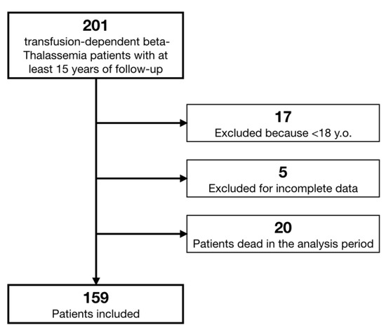 Inclusion criteria consisted of: a clinical and molecular diagnosis of β-thalassemia major, age of more than 18 years old, and at least fifteen years of follow-up at enrollment. Clinical and laboratory data were collected from the center’s electronic medical records, including the WebThal® database.