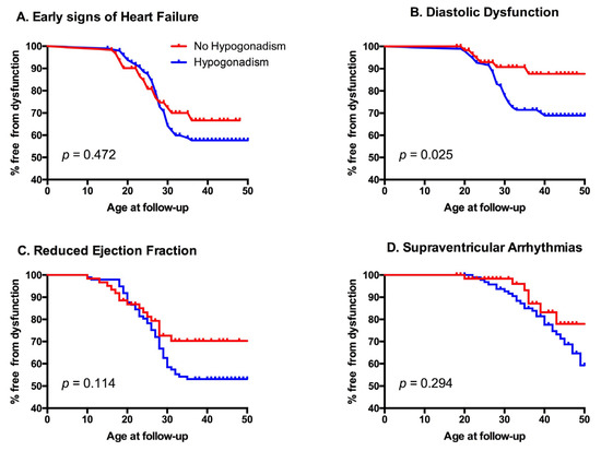 Kaplan–Meyer graphs of different cardiovascular outcomes according to gonadal state. Panel A: impact of hypogonadism on first diagnosis of early signs of heart failure; Panel B: impact of hypogonadism on the appearance of diastolic dysfunction; Panel C: impact of hypogonadism on first recognition of reduced ejection fraction; Panel D: impact of hypogonadism on supraventricular arrhythmias.