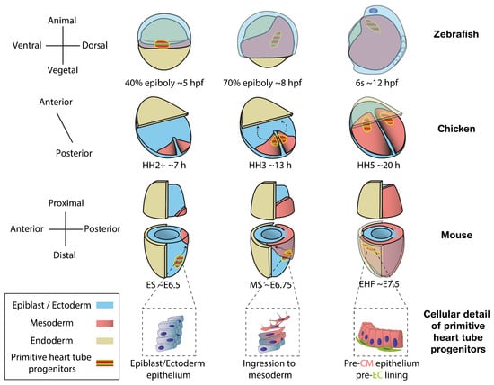 Location of cardiac progenitors in vertebrate models from the onset of gastrulation to the stage preceding primitive heart tube formation. Cardiac progenitors ingress the mesoderm soon after the start of gastrulation, migrating to the opposite side of the embryo to establish the two layers that form the primitive heart tube. The different rows of diagrams show this process in mouse, chicken, zebrafish and a zoom-in for the cellular detail of primitive heart tube progenitors, respectively. Zebrafish diagrams are depicted from dorsal views while those in chick and mouse show ventral views. Morphological staging follows the epiboly rate, Hamburger–Hamilton (HH) and Downs [14] criteria for zebrafish, chicken and mouse, respectively. Approximate time in hours post fertilization (hpf), hours (h) or embryonic day (E) are also provided. CM, cardiomyocytes; EC, endocardium. Dashed arrows depict the migration trajectory of primitive heart tube progenitors during gastrulation.