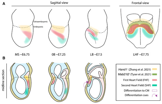 Progenitor domains contributing to heart tube cell populations in the mouse. Diagrams show whole embryos (A) and midline sections (B). Notice how the First Heart Field (FHF), Second Heart Field (SHF) and the recently characterized Mab21l2/Hand1 population stay in a continuum until differentiation cues recruit the FHF to form the primitive heart tube. In the section diagrams (B), endoderm, epiblast and mesoderm are painted in yellow, cyan and light red, following Figure 1 color code. Diagrams were done based on [18,19].