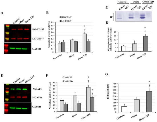 CD147 protein glycosylation and MMP activity in VAT. Representative image of Western blot analysis (A) and quantification of the normalized protein levels (B) of HG-CD147 and LG-CD147 proteins in VAT samples obtained from obese, obese-T2D, and control subjects. Representative image (C) and quantification (D) of glycosylated CD147 protein in the study subjects using Pierce™ Glycoprotein Stain. Representative Western blot (E) and quantification of the normalized protein levels (F) of MGAT5 and MGAT4a proteins in VAT biopsies acquired from obese, obese T2D, and control subjects. (G) Quantitative measurement of MMP2/9 activity using InnoZyme™ Gelatinase (MMP-2/MMP-9) Fluorogenic Activity Assay. Results represent the means ± standard error (SE). The * symbol indicates a p-value < 0.05 when comparing obese subjects with controls. The † symbol indicates a p-value < 0.05 when comparing obese and obese T2D subjects.