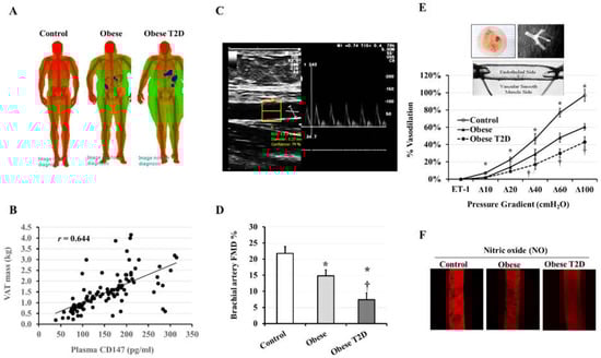 Anthropometric and vascular measurements in the study subjects. (A) Representative images of DEXA scanning performed for body composition assessment in obese, obese T2D, and non-obese subjects. (B) A scatter plot of plasma CD147 and total VAT mass measured via DEXA scanning. (C) Duplex B-mode and PWD (pulsed wave Doppler) ultrasound of brachial artery FMD. (D) Brachial artery FMD in obese, obese T2D, and control individuals was computed by deducting the average diameter at baseline from the largest measures after the blood pressure cuff was deflated. (E) FID measures in VAT-isolated arterioles correspond to intraluminal pressure gradients gradually increasing from Δ10 to Δ100 cmH2O. The insert images represent VAT tissues, isolated arterioles, and cannulated arterioles. (F) Representative images of NO production by VAT arterioles measured by fluorescence microscopy. Results represent the means ± standard error (SE). The * symbol indicates a p-value < 0.05 when comparing obese subjects with controls. The † symbol indicates a p-value < 0.05 when comparing obese and obese T2D subjects.