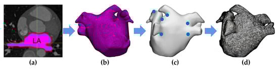 Semi-automatic segmentation of the LA region from CTA images was performed using CemrgApp v2.2 (Figure 1a) []. The LA region was defined as the pixels contained within the LA endocardial surface, including the PVs, the mitral valve (MV), as well as the LA appendage (LAA) []. Due to the MV showing a similar image intensity as LA and the left ventricle, a cutting plane was manually inserted in the position of the MV to mark seed points at the edge of the MV in subsequent steps. Then, region growing was used to separate the LA region from the selected slices; to reduce the impact of noise or image artefacts on the segmentation outcome, details were manually corrected. The resulting segmentations were exported as a triangular mesh.