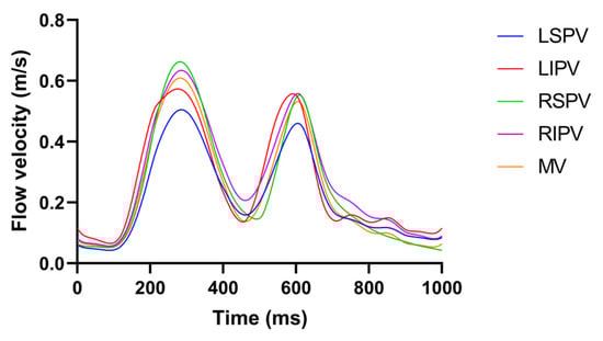 The pulsatile blood flow profiles at the four PVs and MV in the LA model are shown in Figure 2, in which the characteristics of the pulsatile blood flow profiles at the four PVs (peak flow velocity, ratio of peak flow velocity, and time–velocity integral, etc.) and the mean LA flow velocity are within the range described in the literature [,].