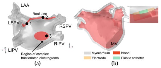 Figure 3a shows the three representative ablation targets selected based on the mainstream catheter ablation strategies for persistent AF in the LA model, corresponding to circumferential pulmonary vein isolation (PVI) (ablation target 1); linear ablation (ablation target 2); and complex fractionated electrograms (CFAE) ablation (ablation target 3), respectively [,]. Ablation target 1 is on the left superior pulmonary vein (LSPV) ostium, ablation target 2 is on the roofline in the middle of the LSPV and right superior pulmonary vein (RSPV), and ablation target 3 is on the LA posterior wall (PW) and is perpendicular to the right inferior pulmonary vein (RIPV) ostium. Among them, ablation targets 2 and 3 are selected based on the wide antral circumferential ablation (WACA) strategy, which is characterized by the catheter being placed ≥1.5 cm away from the PV ostium [].