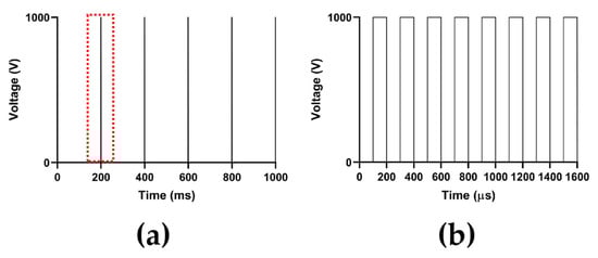 - In the computation of the temperature distribution, the amplitude of the is 1000 V, and the total PFA duration is 1 s, containing five pulse trains and five pulse train intervals; each pulse train contains eight pulses and eight pulse intervals, each pulse width and pulse interval are both 100 μs, and the pulse train interval is 198.4 ms, to consist with the parameters of PFA generators used in the animal experiment []. The waveform of in the computation of the temperature distribution is shown in Figure 4.