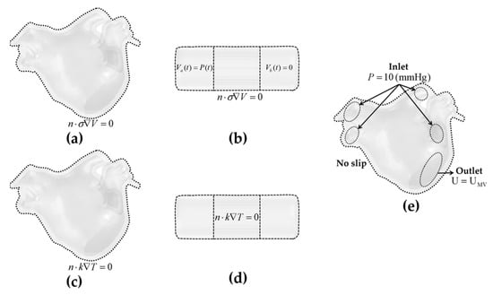 The electrical boundary conditions, thermal boundary conditions, and CFD boundary conditions of the ablation model. Electrical boundary conditions of (a) the LA model and (b) the catheter model; thermal boundary conditions of (c) the LA model and (d) the catheter model; and CFD boundary conditions of (e) the LA model.