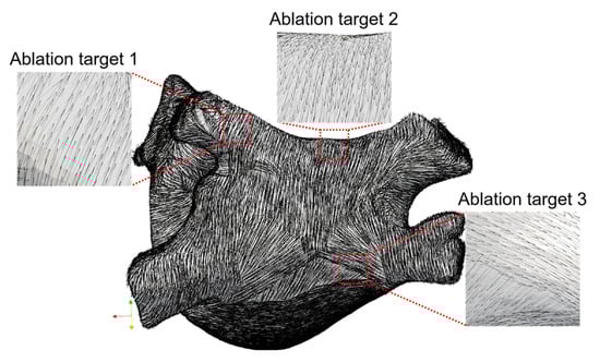 According to Equation (6), the AC is essentially reflected by the distribution of fiber orientation throughout the entire LA; therefore, the correctness of the fiber orientation incorporated into the LA model is crucial for the subsequent investigation. In this study, the generated fiber orientation conforms to the realistic fiber orientation based on the descriptions in the literature and histological observations [,,]. Figure 6 shows the fiber orientation incorporated into the LA model and the details of the fiber orientation at three ablation targets.